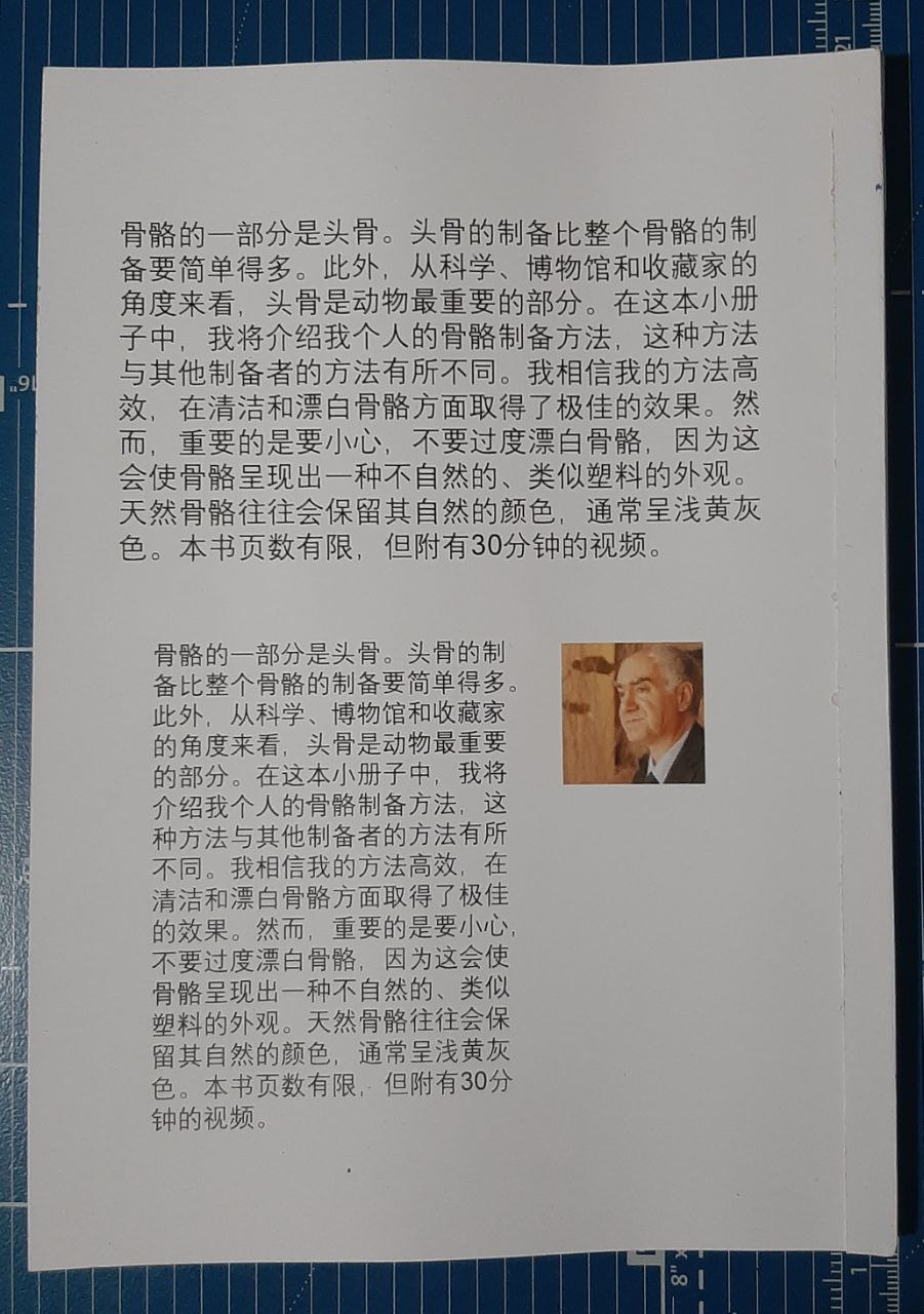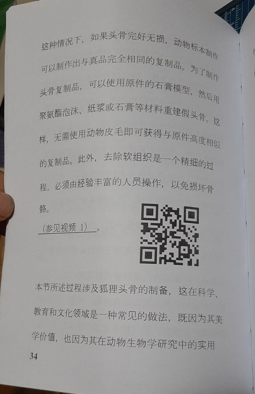 本书介绍了一种简单快捷的狐狸头骨制作方法。本书尺寸为22.5 x 15厘米,共100页。书中还包含一段30分钟的视频,分为四个部分。每个部分旁边都有一个二维码,用手机扫描即可观看相应的视频。您可以在本书的第二张图片中查看。