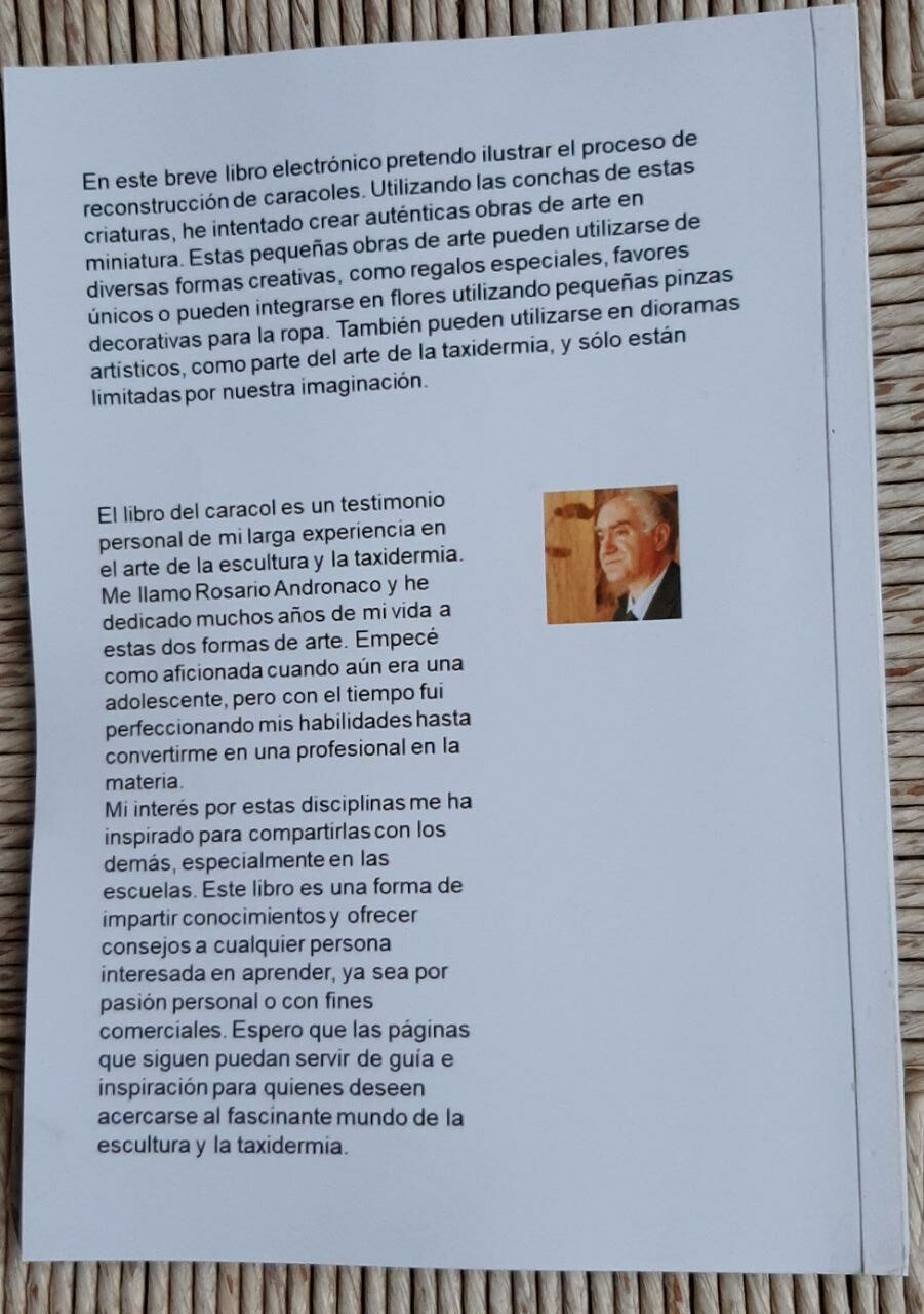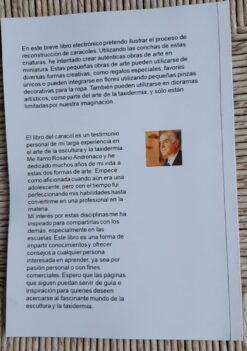 En este breve libro electrónico pretendo ilustrar el proceso de reconstrucción de caracoles. Utilizando las conchas de estas criaturas, he intentado crear auténticas obras de arte en miniatura. El tamaño del libro es de 20,5 x 14,5 cm y contiene 35 páginas. También incluye 15 minutos de película divididos en 4 segmentos. Junto a cada segmento hay una imagen de un código QR que, al encuadrarlo con la cámara de un teléfono, permite ver la película correspondiente; puede probarlo desde la segunda imagen del libro.