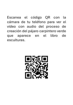 De la taxidermia a la escultura. El libro trata del proceso de esculpir un pájaro carpintero verde a través de mi propio método de preparación. El tamaño del libro es de 20,5 x 14,5 cm y contiene 114 páginas. También incluye 93 minutos de vídeo divididos en 25 segmentos. Junto a cada segmento hay una imagen de un código QR que, al encuadrarlo con la cámara de un teléfono, permite ver la película correspondiente; puede probarlo a partir de la segunda imagen del libro.