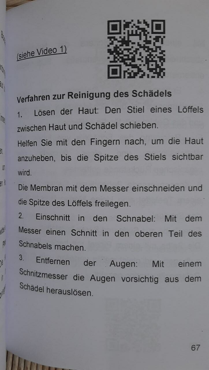 Das Buch behandelt den Prozess der Einbalsamierung eines Eichelhähers (Garrulus glandarius) nach meiner persönlichen Präparationsmethode. Das Buch hat eine Größe von 21,00 x 15 cm und umfasst 137 Seiten. Außerdem sind 65 Minuten Video in 18 Abschnitte unterteilt enthalten. Neben jedem Abschnitt befindet sich ein QR-Code, der, sobald er mit der Kamera eines Smartphones erfasst wird, die Anzeige des entsprechenden Videos ermöglicht. Sie können dies anhand des zweiten Bildes des Buches ausprobieren.