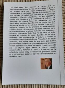 El libro describe el proceso de embalsamamiento de un arrendajo euroasiático (Garrulus glandarius) mediante mi método personal de preparación. Mide 21 x 15 cm y consta de 123 páginas. Incluye además 65 minutos de vídeo divididos en 18 segmentos. Junto a cada segmento hay un código QR que, al escanearlo con la cámara de un teléfono inteligente, permite ver el vídeo correspondiente. Puede verlo en la segunda imagen del libro.