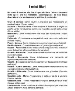 Il libro affronta il processo di preparazione del cranio di una volpe attraverso un metodo semplice e rapido. Le dimensioni del libro sono di 22,5 x 15 cm e contiene 100 pagine. Inoltre, sono inclusi 30 minuti di filmati suddivisi in 4 segmenti. Accanto a ciascun segmento è presente l’immagine di un QR code che, una volta inquadrato con la fotocamera di un telefono, consente di visualizzare il filmato corrispondente. potete provarlo dalla seconda immagine del libro.