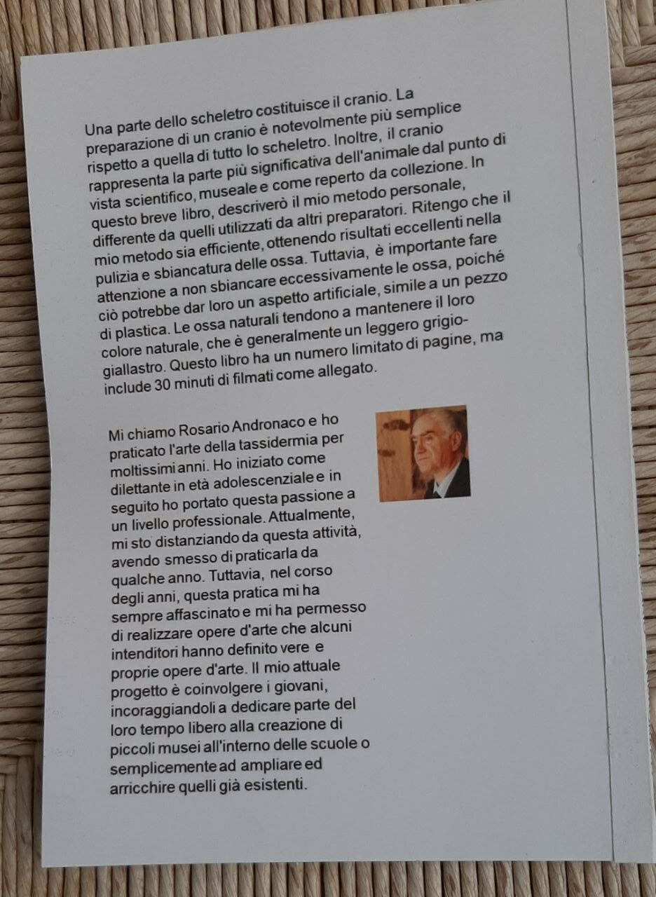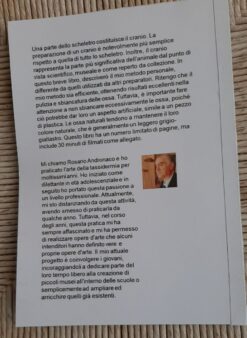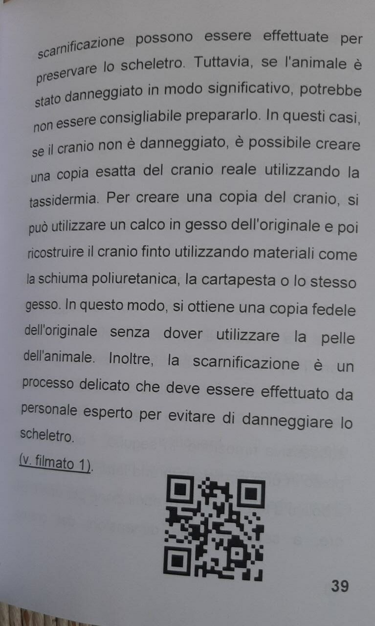 Il libro affronta il processo di preparazione del cranio di una volpe attraverso un metodo semplice e rapido. Le dimensioni del libro sono di 22,5 x 15 cm e contiene 100 pagine. Inoltre, sono inclusi 30 minuti di filmati suddivisi in 4 segmenti. Accanto a ciascun segmento è presente l’immagine di un QR code che, una volta inquadrato con la fotocamera di un telefono, consente di visualizzare il filmato corrispondente. potete provarlo dalla seconda immagine del libro.