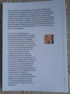 Dans ce petit livre électronique, j’ai l’intention d’illustrer le processus de reconstitution des escargots. En utilisant les coquilles de ces créatures, j’ai tenté de créer d’authentiques œuvres d’art miniatures. Le livre mesure 20,5 x 14,5 cm et contient 34 pages. Il contient également 15 minutes de film divisé en 4 segments. À côté de chaque segment se trouve l’image d’un code QR qui, lorsqu’il est cadré avec l’appareil photo d’un téléphone, permet de visionner le film correspondant. Vous pouvez l’essayer à partir de la deuxième image du livre.