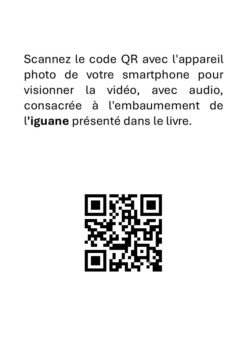Le livre traite du processus d’embaumement d’un Iguane à travers ma propre méthode de préparation. Le livre mesure 20,5 x 14,5 cm et contient 179 pages. Il contient également 3 heures et 15 minutes de vidéo divisées en 36 segments. À côté de chaque segment se trouve l’image d’un code QR qui, lorsqu’il est cadré avec l’appareil photo d’un téléphone, permet de visionner le film correspondant. Vous pouvez l’essayer à partir de la deuxième image du livre.